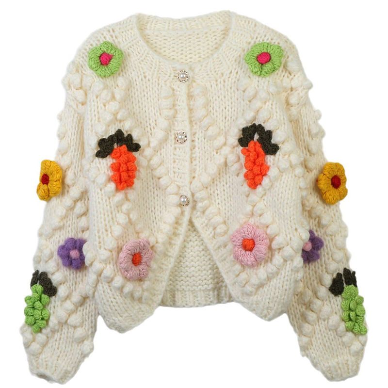 Chunky Knit Floral Cardigan-White Crop Sweater with Colorful Flower Embellishments-Knit Top